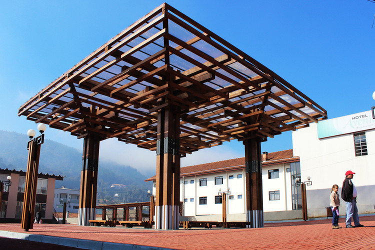 Composta por quatro araucárias entrelaçadas, feitas de madeira nativa, a praça foi projetada pelo escritório Arquea Arquitetos, de Curitiba.