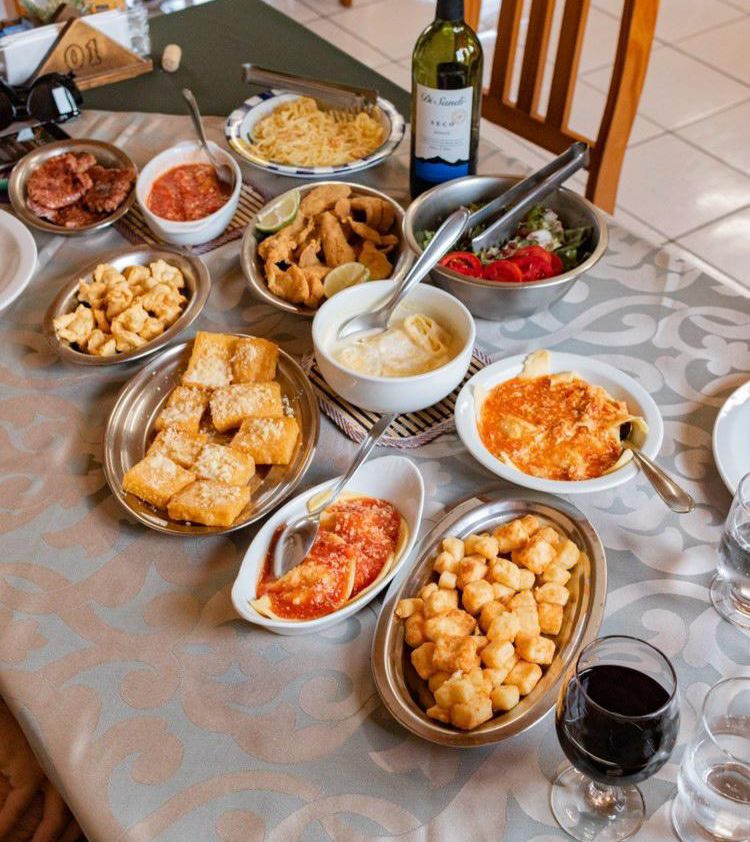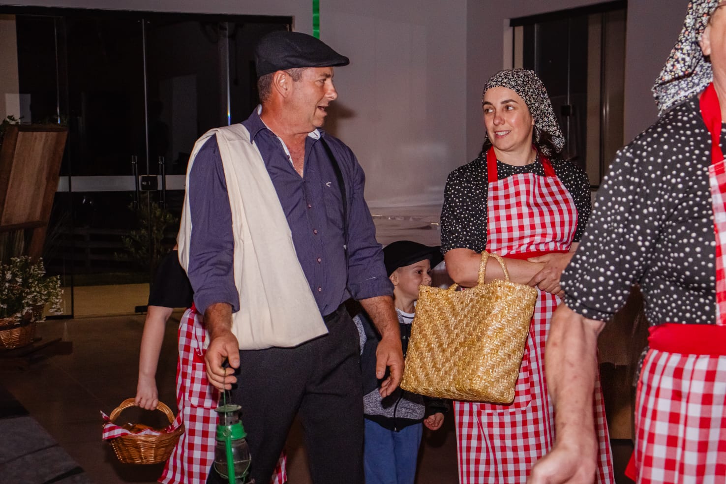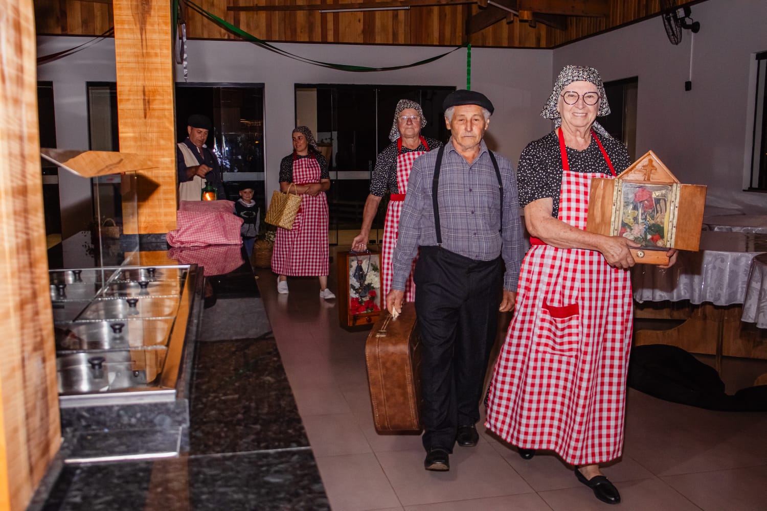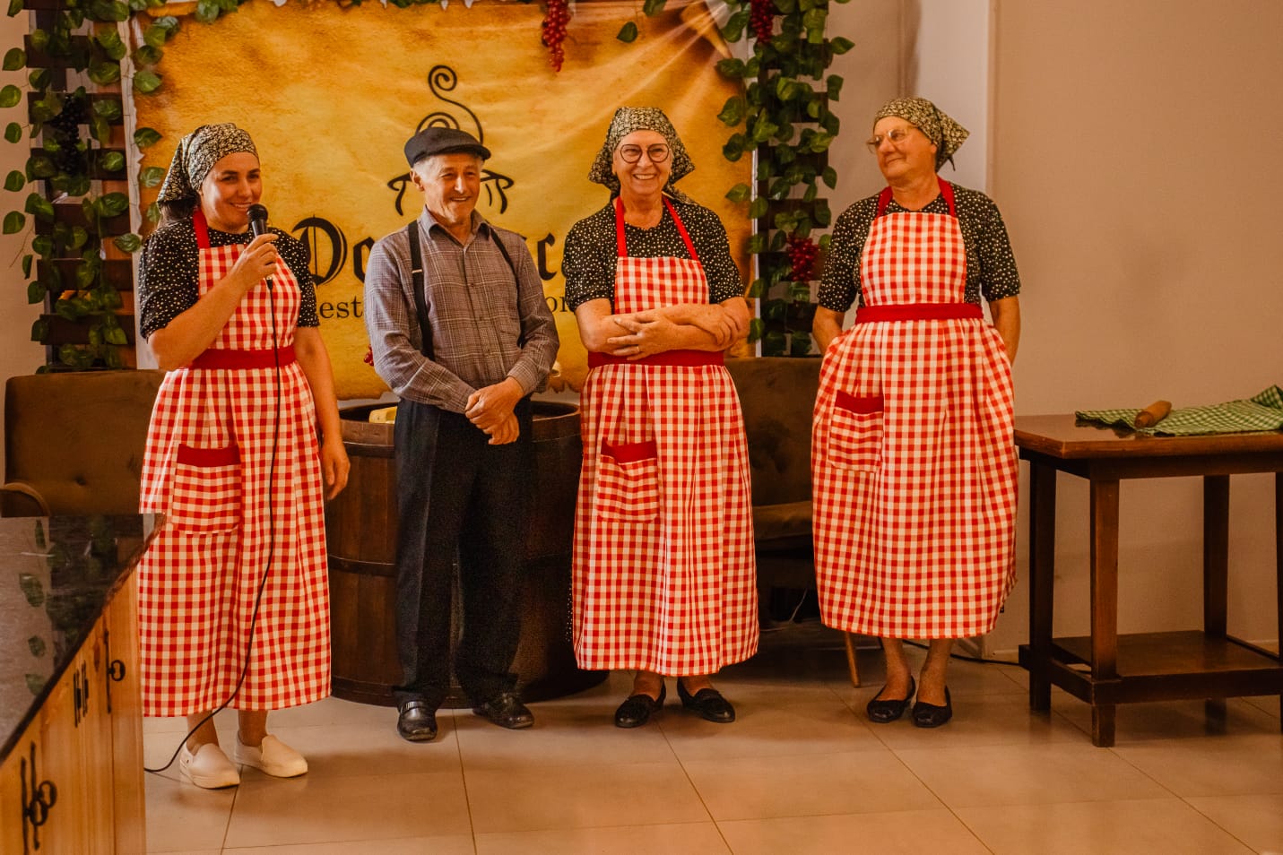 A cada etapa, o visitante é convidado a vivenciar costumes que atravessaram gerações: ver a polenta ser cortada com barbante, ajudar no preparo do macarrão feito no rolo e na clássica “máquina da nona”, e até vestir boinas, suspensórios e lenços para fotos que eternizam o momento. Tudo isso ao som das canções italianas e histórias que resgatam a memória de tempos passados.